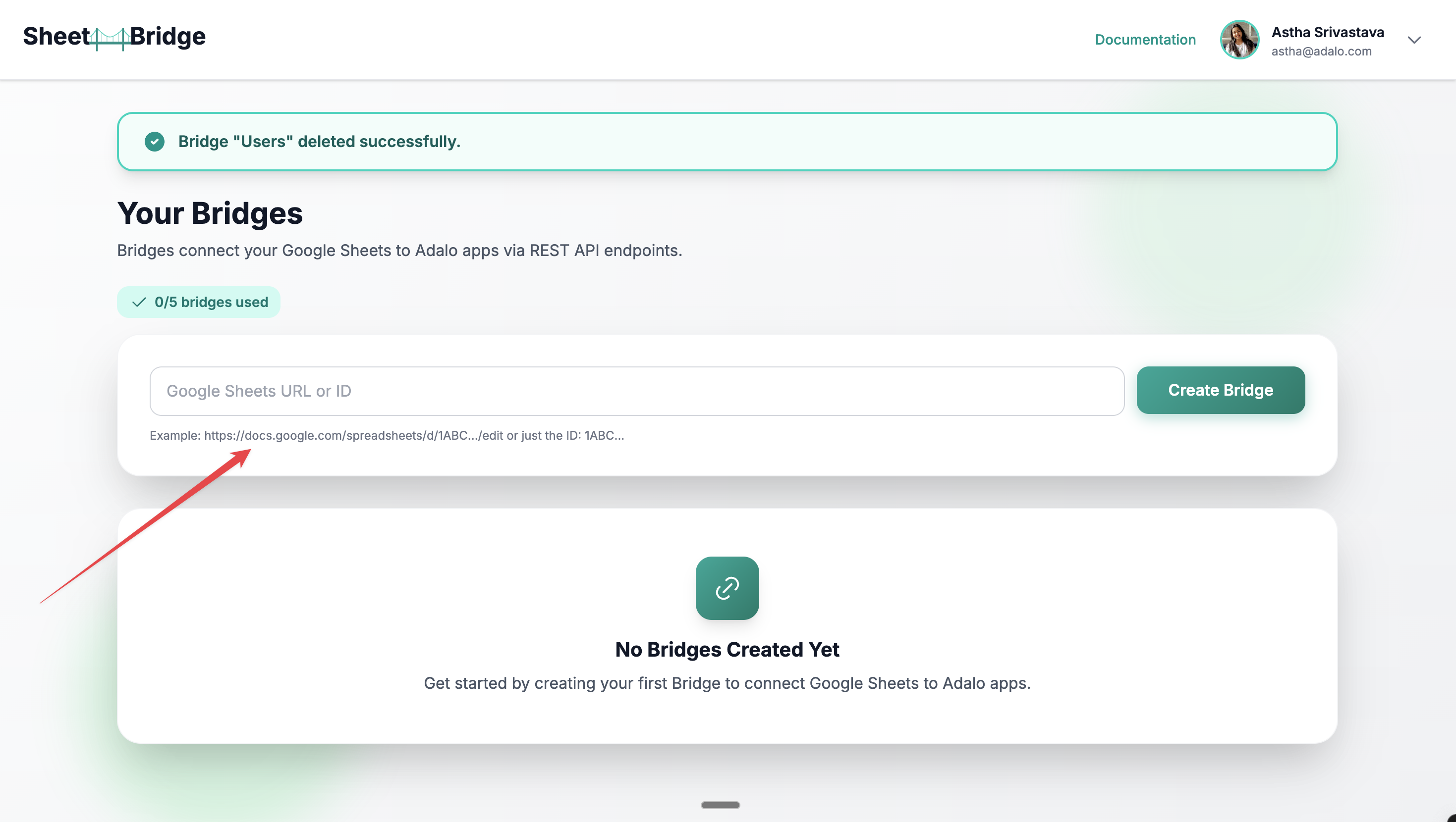 3. In SheetBridge, paste your Google Spreadsheet URL (or ID) into the SheetBridge field to create your Bridge.