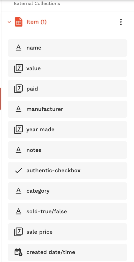 * Use clear collection names that match your tab names (for example: Customers, Orders, Inventory). These can be changed by editing the settings in the external collection.