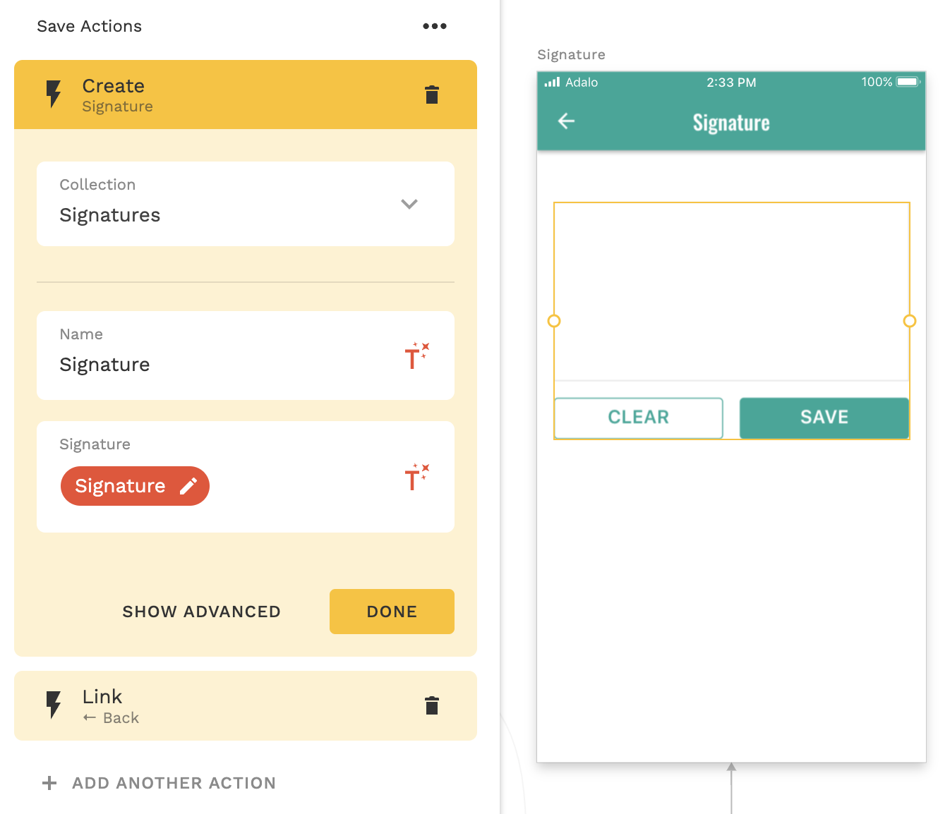 **7.)** 保存アクションにスクロールして、新しい「Create Action」を追加し、[Magic Text](https://help.adalo.com/ja/component-basics/inserting-dynamic-text) で Signature Pad > Signature を選択します