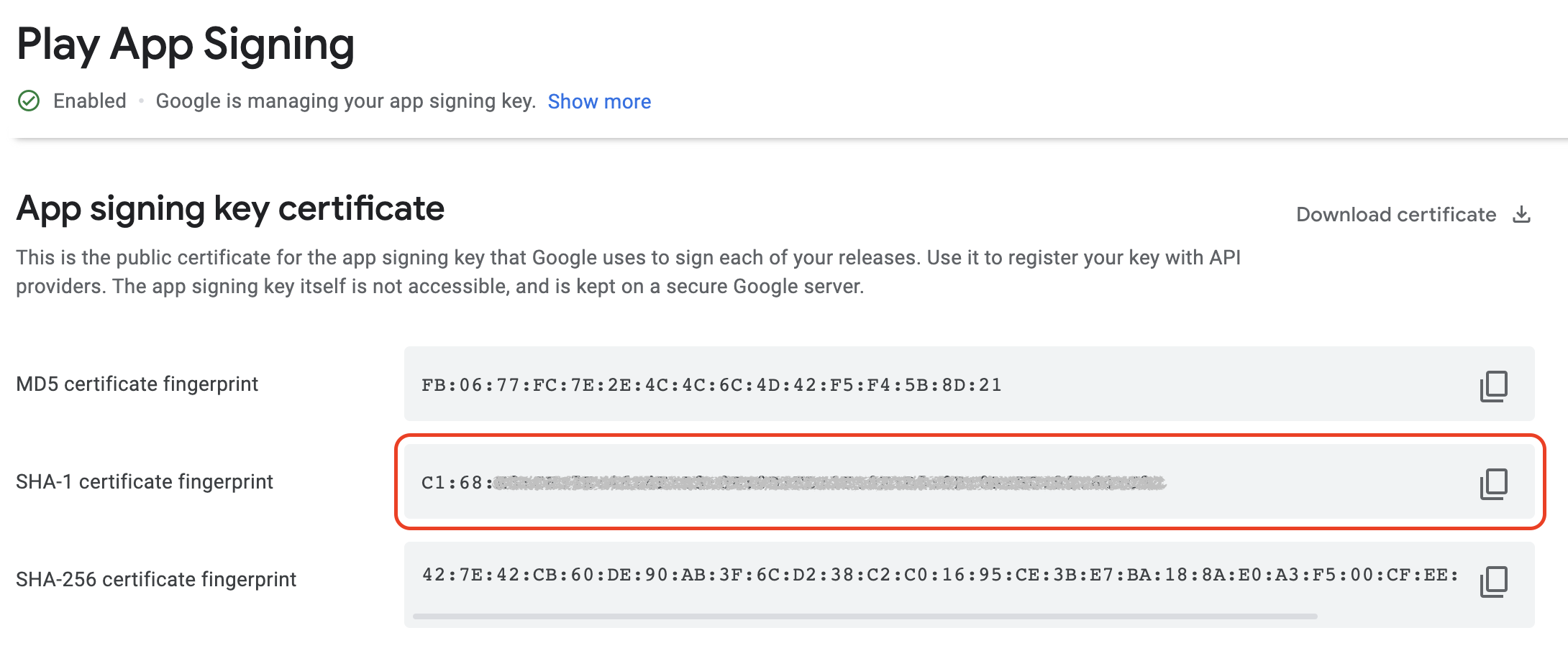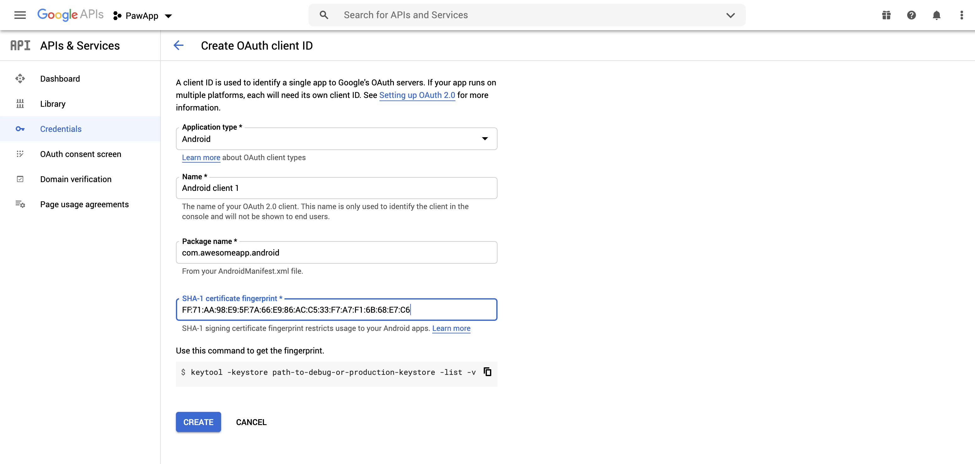 **3.)** **SHA-1** Fingerprint をコピーし、Android クライアント ID のセットアップの **Fingerprint** フィールドに貼り付けます。