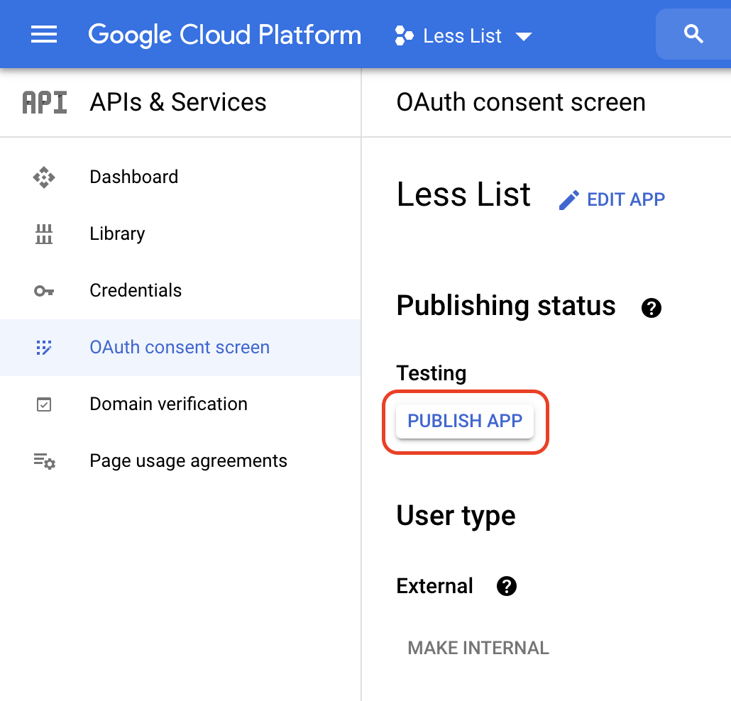 デフォルトでは、同意画面はテストモードになっています。このダッシュボードで **Publish** ボタンをクリックするまで、Google Developer アカウントとテスターだけが Google でサインインを使用できます。いつでもテストと本番の間を切り替えることができます。