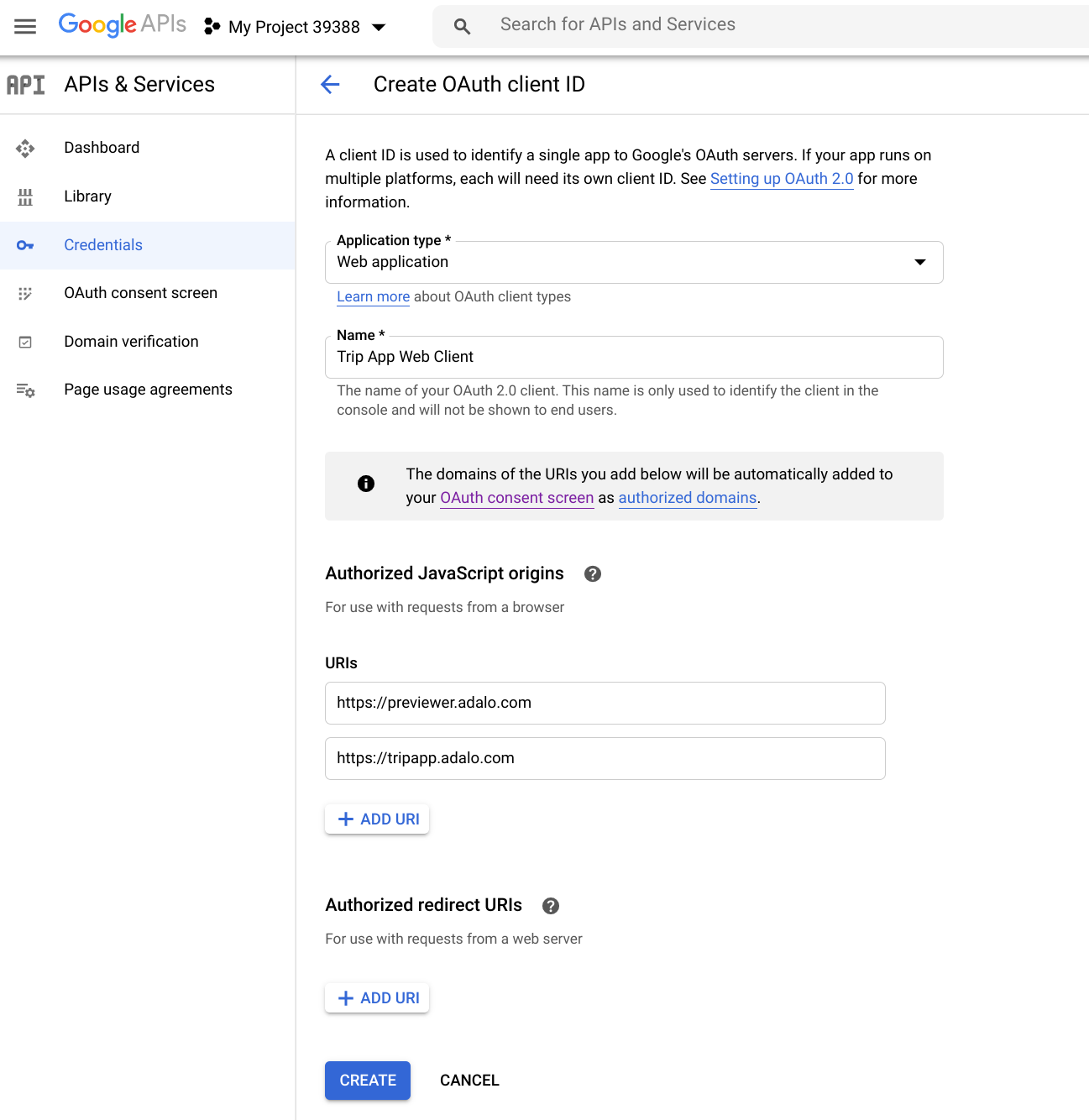 **19.)** 認可された JavaScript オリジンに、2つの URI を入力します: "<https://previewer.adalo.com>" および Adalo アプリのカスタム Web ドメイン（Web アプリとしてアクセス可能な場合）、その後 **Create** をクリックします。