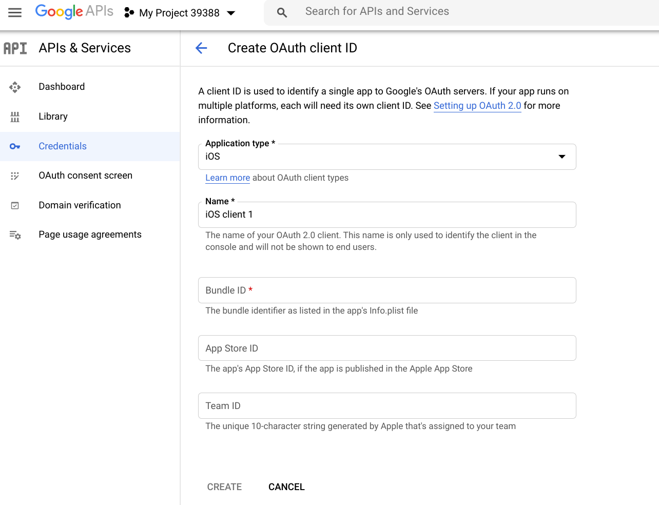**23.)** アプリケーションタイプとして **iOS** を選択し、iOS バンドル ID を入力して **Create** をクリックします（まだ iOS バンドルを作成していない場合は、[こちらのヘルプ](https://help.adalo.com/testing-your-app/publishing-to-the-apple-app-store) を参照してください — Web クライアント ID ステップを完了していれば、Web および PWA でテストできます）。