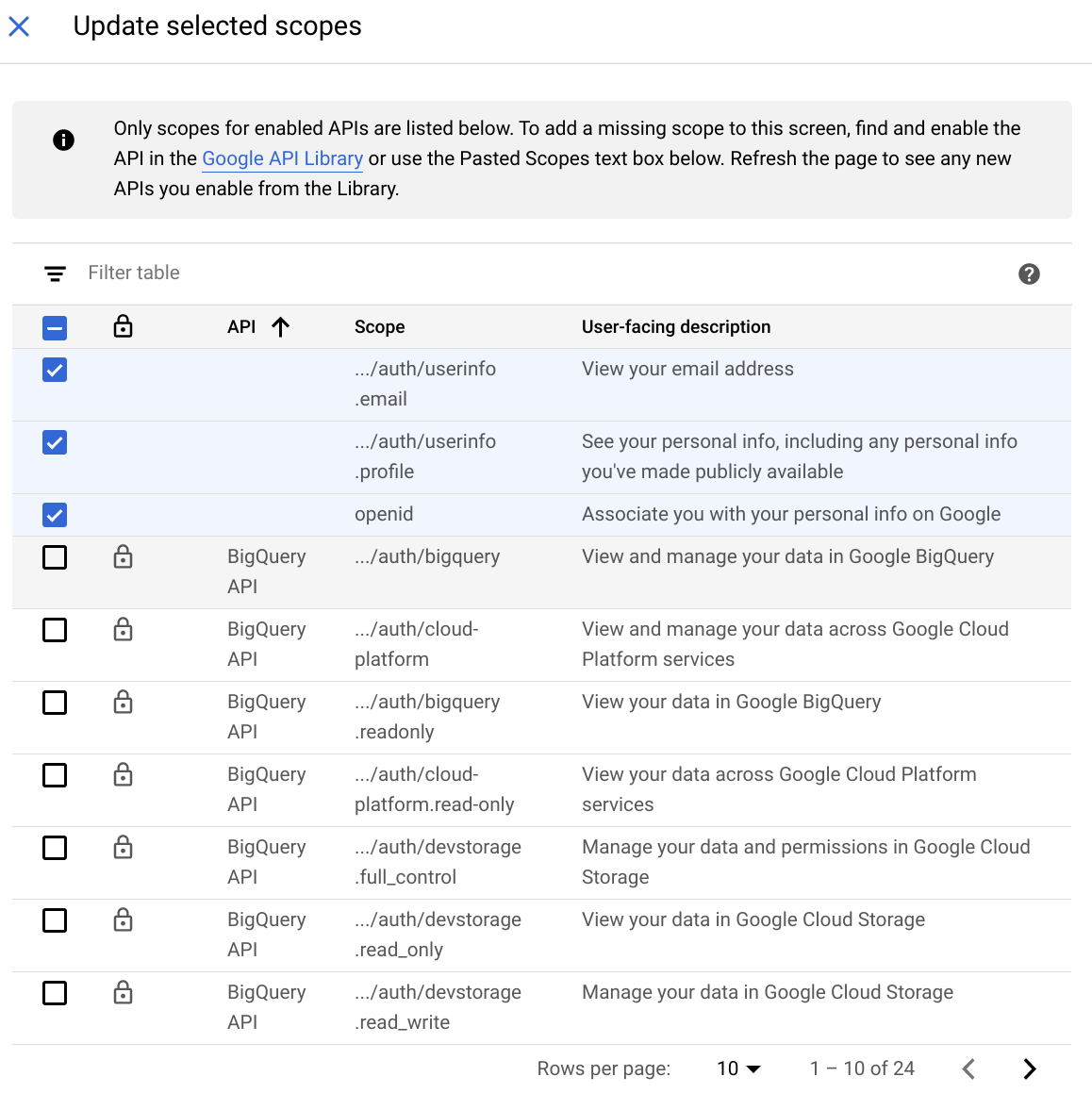 **11.)** **スコープの追加または削除**ボタンをクリックし、最初の3つのスコープを選択します。 ![](https://797861279-files.gitbook.io/~/files/v0/b/gitbook-x-prod.appspot.com/o/spaces%2F4EFNSNZLMs5AZ70x2P33%2Fuploads%2Fgit-blob-0394231dafde29a77dac73dbc1ae59a2147c89a6%2FScreenshot%202020-10-01%20at%209.42.36%20PM.png?alt=media)