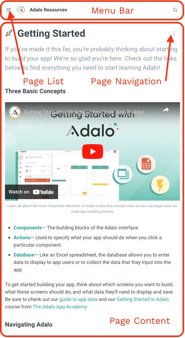 各情報がページ内の赤い四角形やコンテナ内に存在することに注意してください。画面サイズが**モバイル**ビューに変更されると、これらのコンテナが変更されて画面サイズの違いに対応するのがわかります。ページリストはメニューボタン内に隠され、ページナビゲーションは右上のケバブアイコンを通じても完全にアクセスできなくなっています。