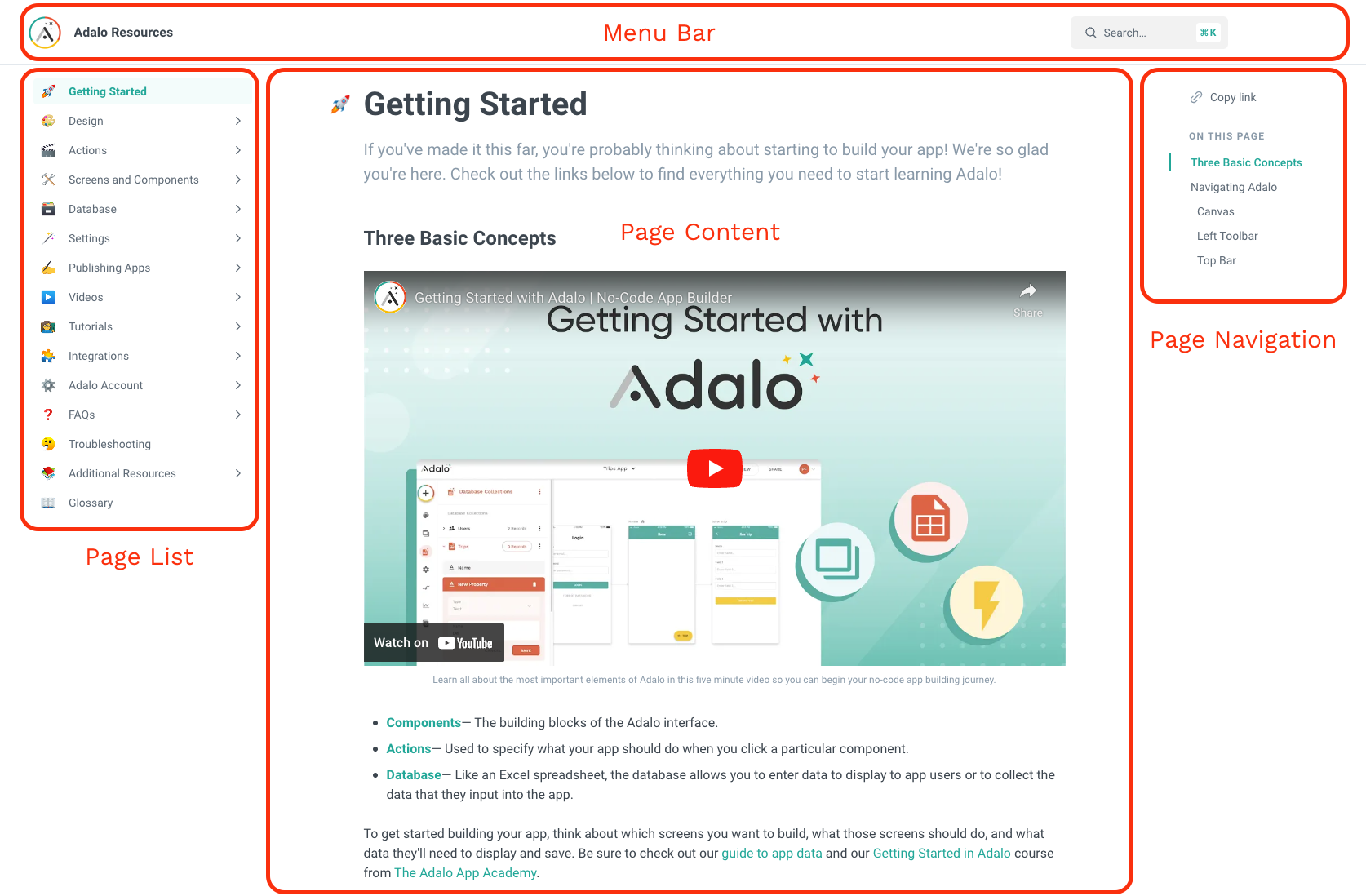 複数のデバイス向けにデザインする際、表示したい情報に場所がないとすぐに混乱します。似た情報をボックスやコンテナに分割することで、後で異なる画面サイズに合わせるために情報の断片を移動する必要がある場合に役立ちます。使用している他のアプリを見ることで、情報のセクションについて考えるのに役立ちます。例としてこのヘルプドキュメントを見てみましょう：