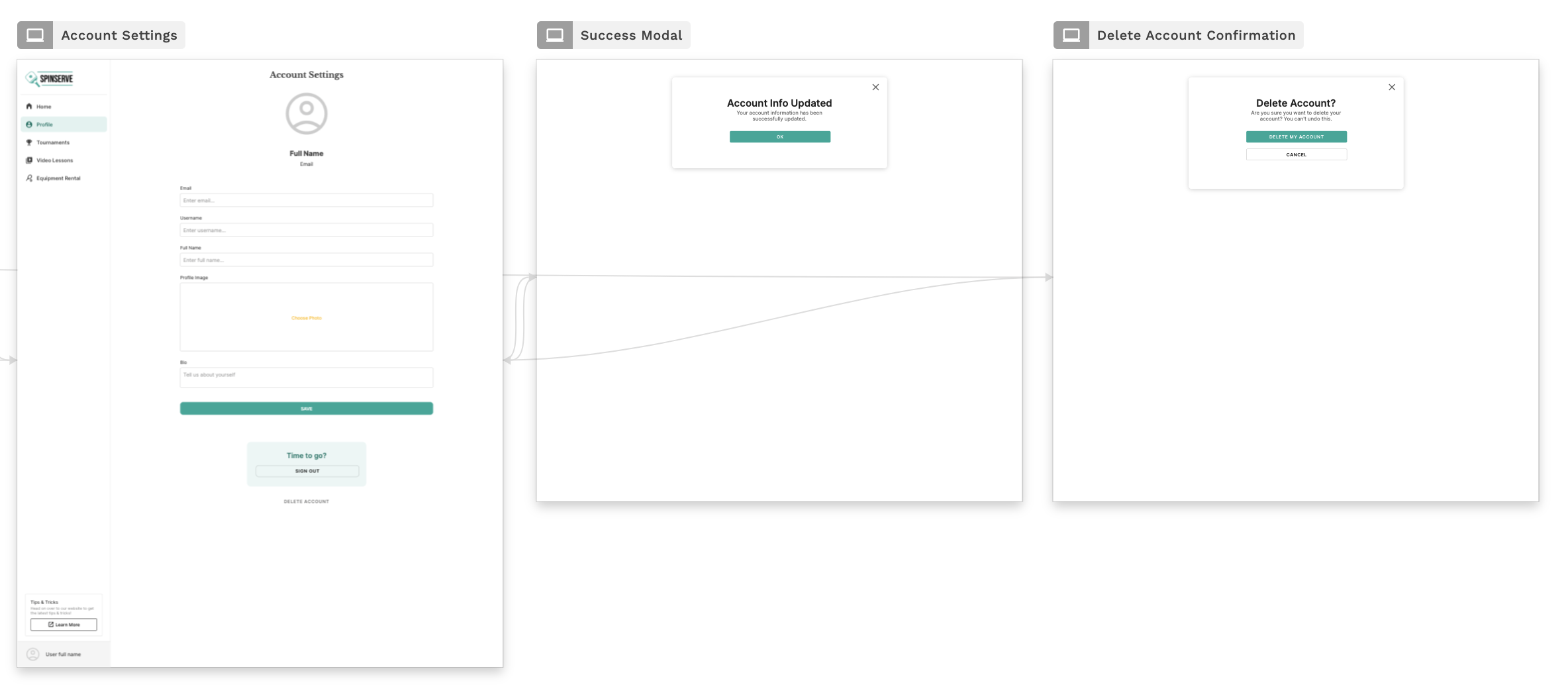 アカウント設定、成功モーダル、削除アカウント確認は、ユーザープロファイル＆アカウント設定機能テンプレートに含まれる3つの追加画面ですが、これらは他のヘルプドキュメントで詳しく説明されています。