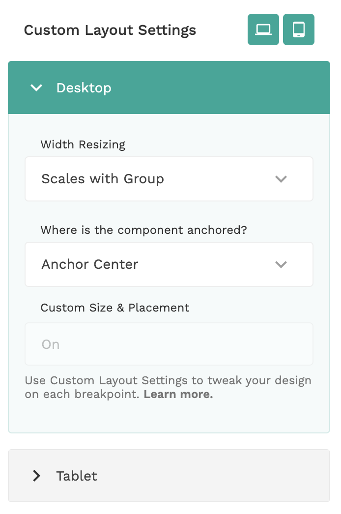 一部のコンポーネントには、画面サイズに基づいたカスタムレイアウトが付属しています。これらの設定を表示するには、レイアウトタブを確認し、カスタムレイアウト設定までスクロールします。