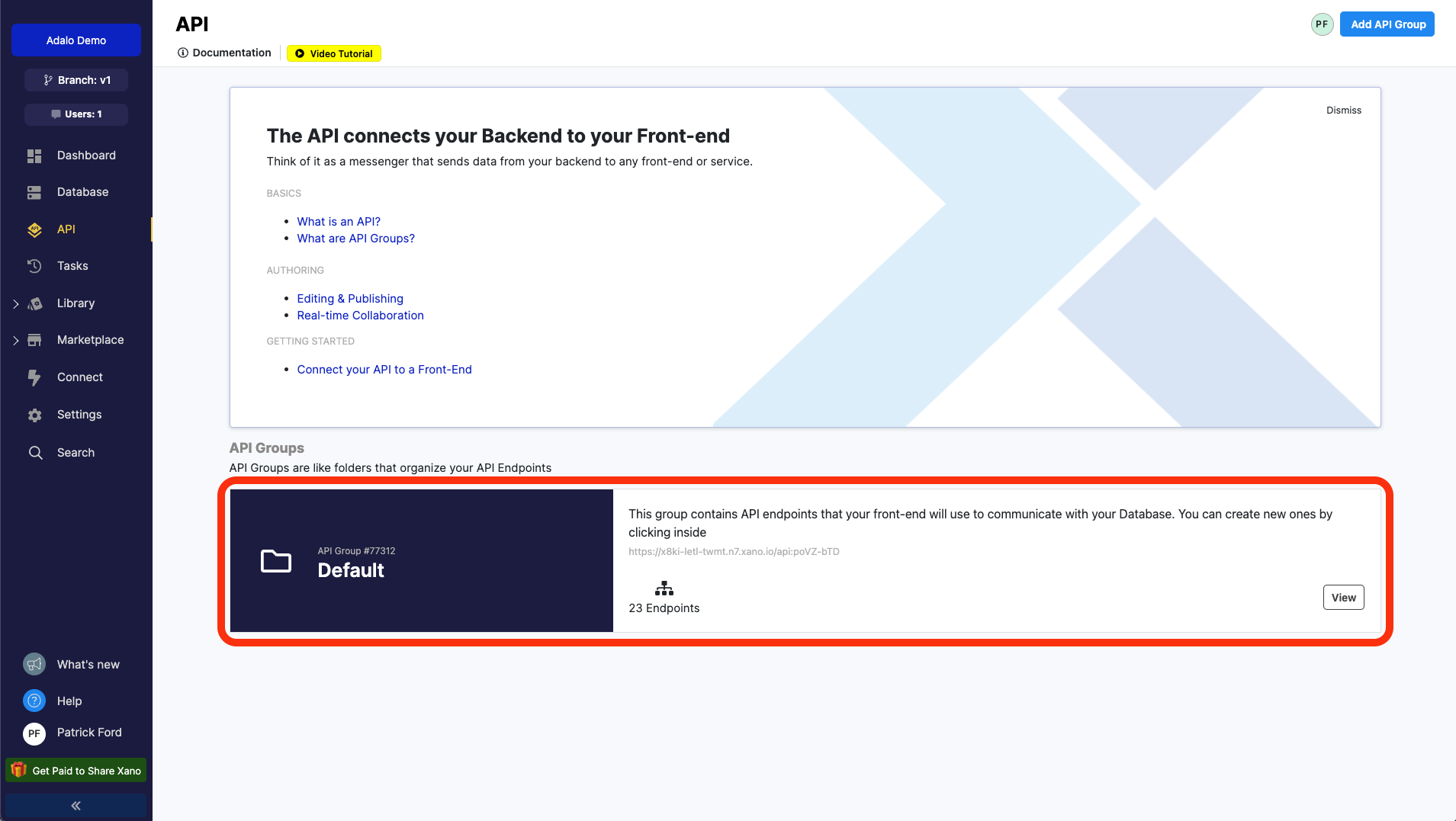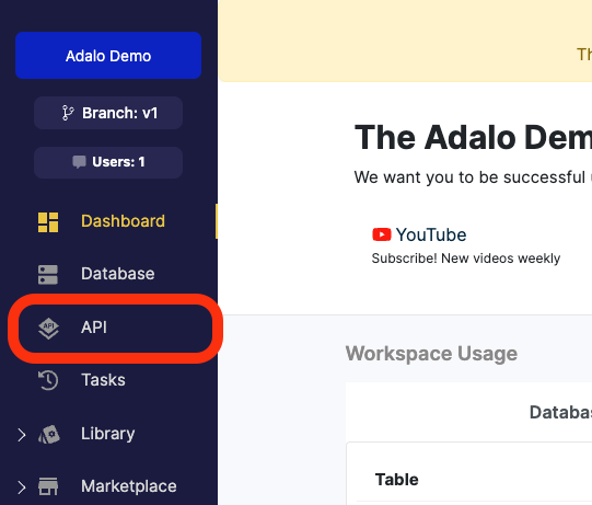 #### 1. Xanoの新しいワークスペースで、左メニューのAPIタブをクリックします。