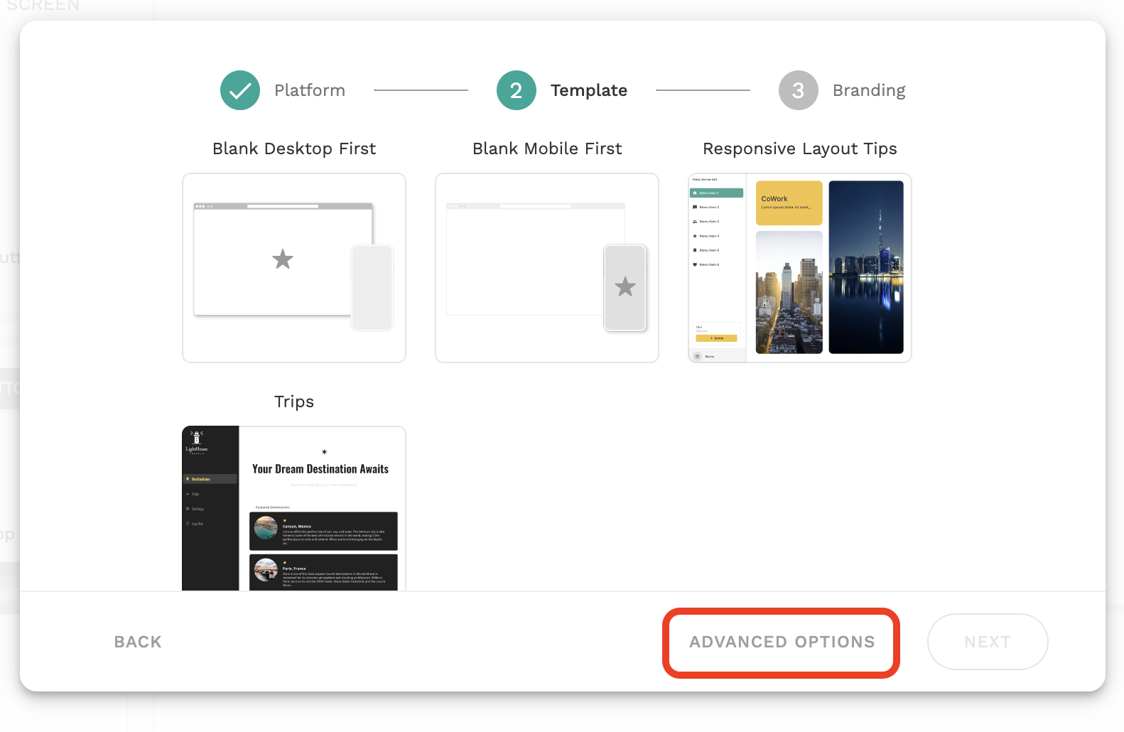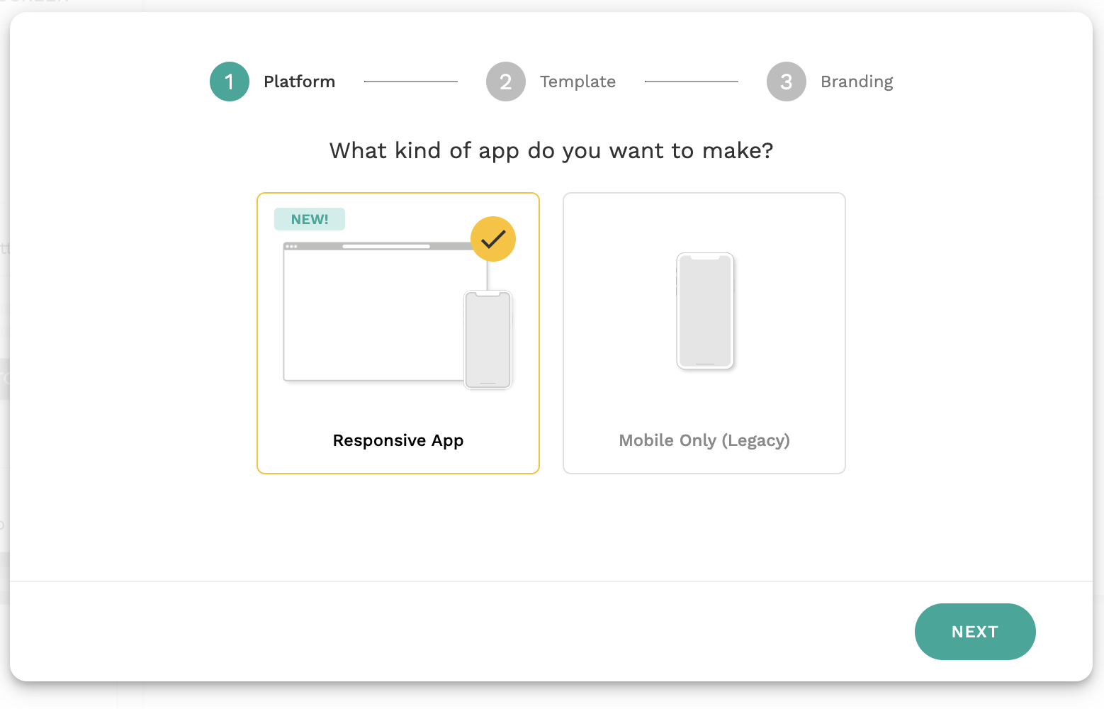 Adaloを使用するのが初めての場合は、アカウントを作成するとすぐに表示されます。すでに作成したアプリがある場合は、Adaloビルダーの上部中央にあるアプリ切り替えをクリックし、アプリを作成します。レスポンシブWebアプリを作成するか、モバイルレガシーアプリを作成することもできます。