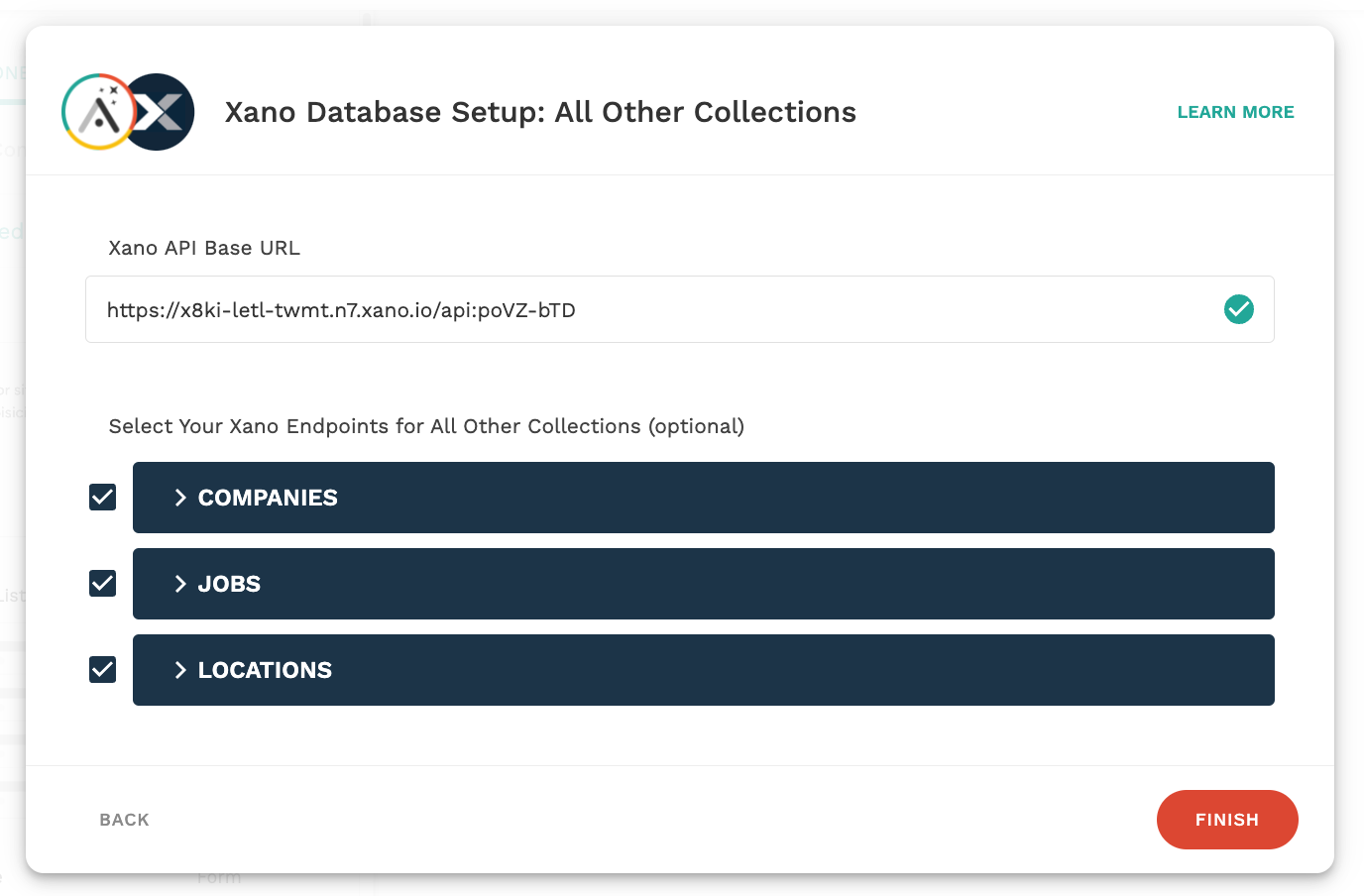 #### 9. Adaloは今、Xanoデータベース内の他のすべてのテーブルにアクセスし、インポートするテーブルを選択できるようにします。インポートするテーブルをチェックし、次に「Finish」をクリックします。