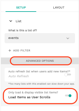 #### 2. 次に、\[詳細オプション]セクションをクリックし、\[ユーザーがスクロールするとアイテムをロード]トグルをオンにします。