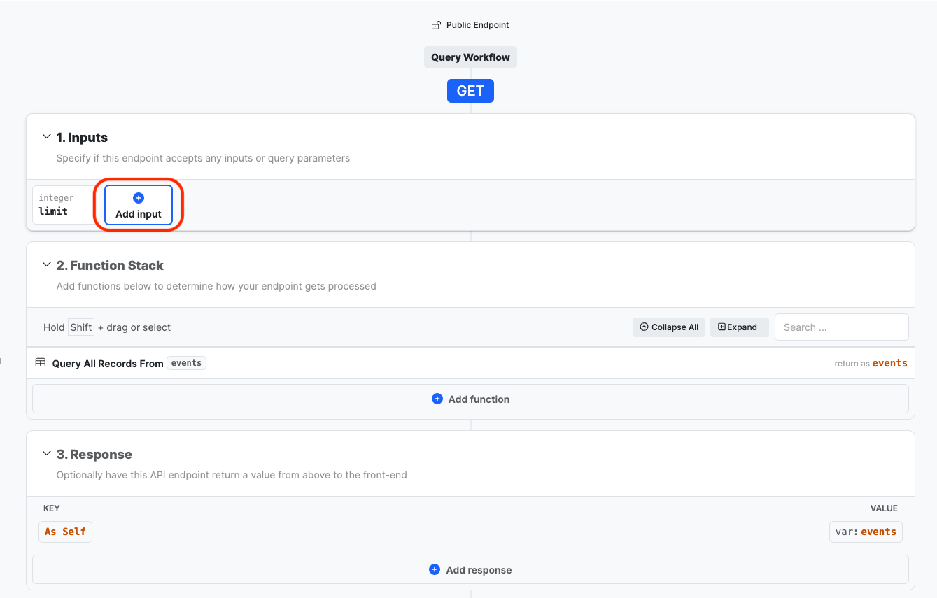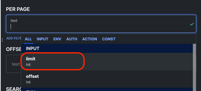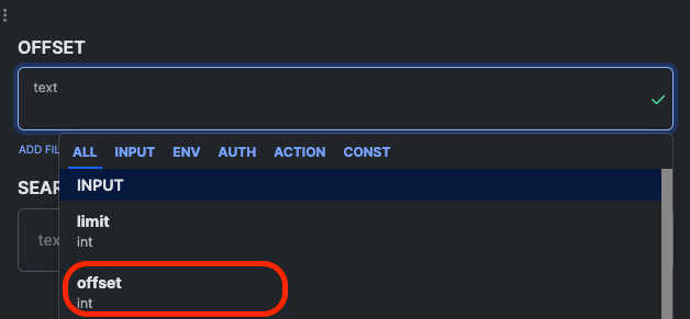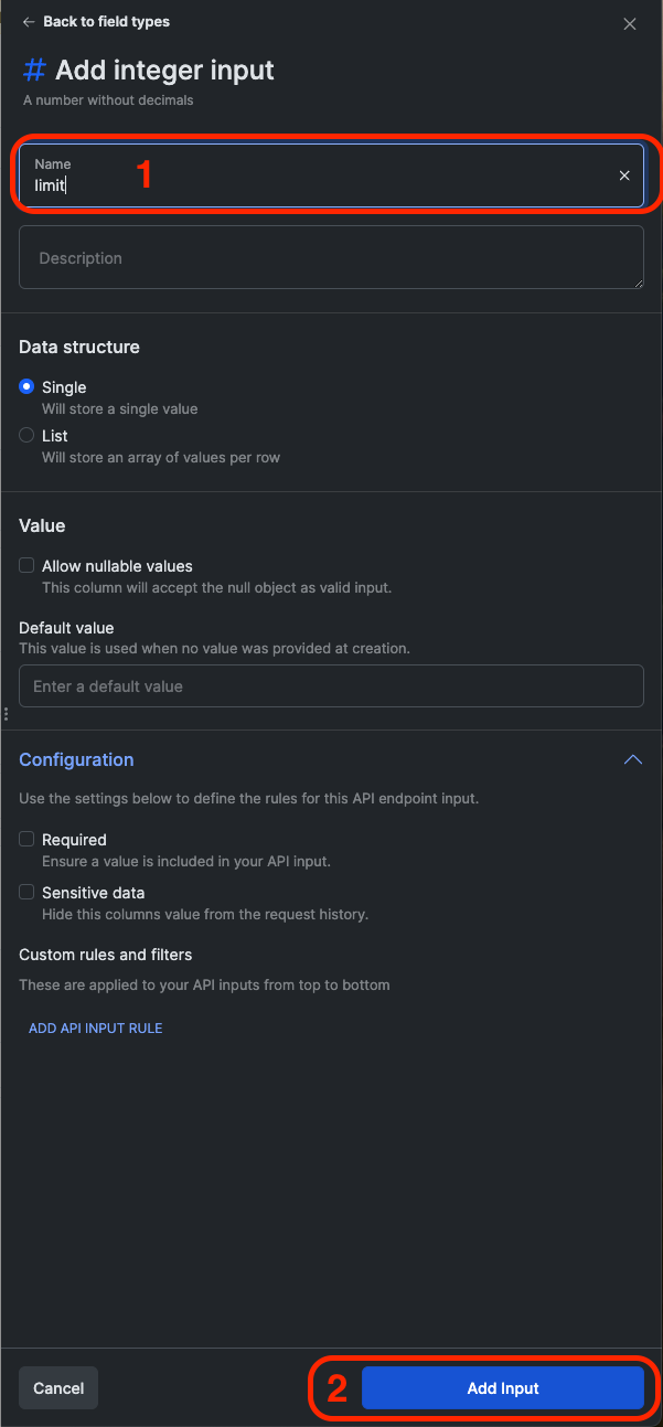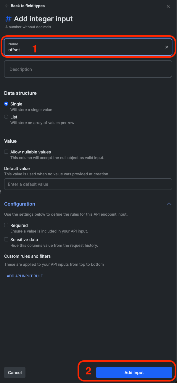 #### 10. 今度は「offset」という別のIntegerを追加し、\[入力を追加]をクリックします。