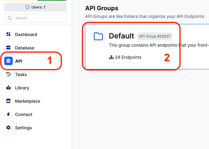 #### 4. Xanoダッシュボードで、左メニューのAPIタブをクリックし、リストが参照しているテーブルのエンドポイントを保持するAPIグループを選択します。