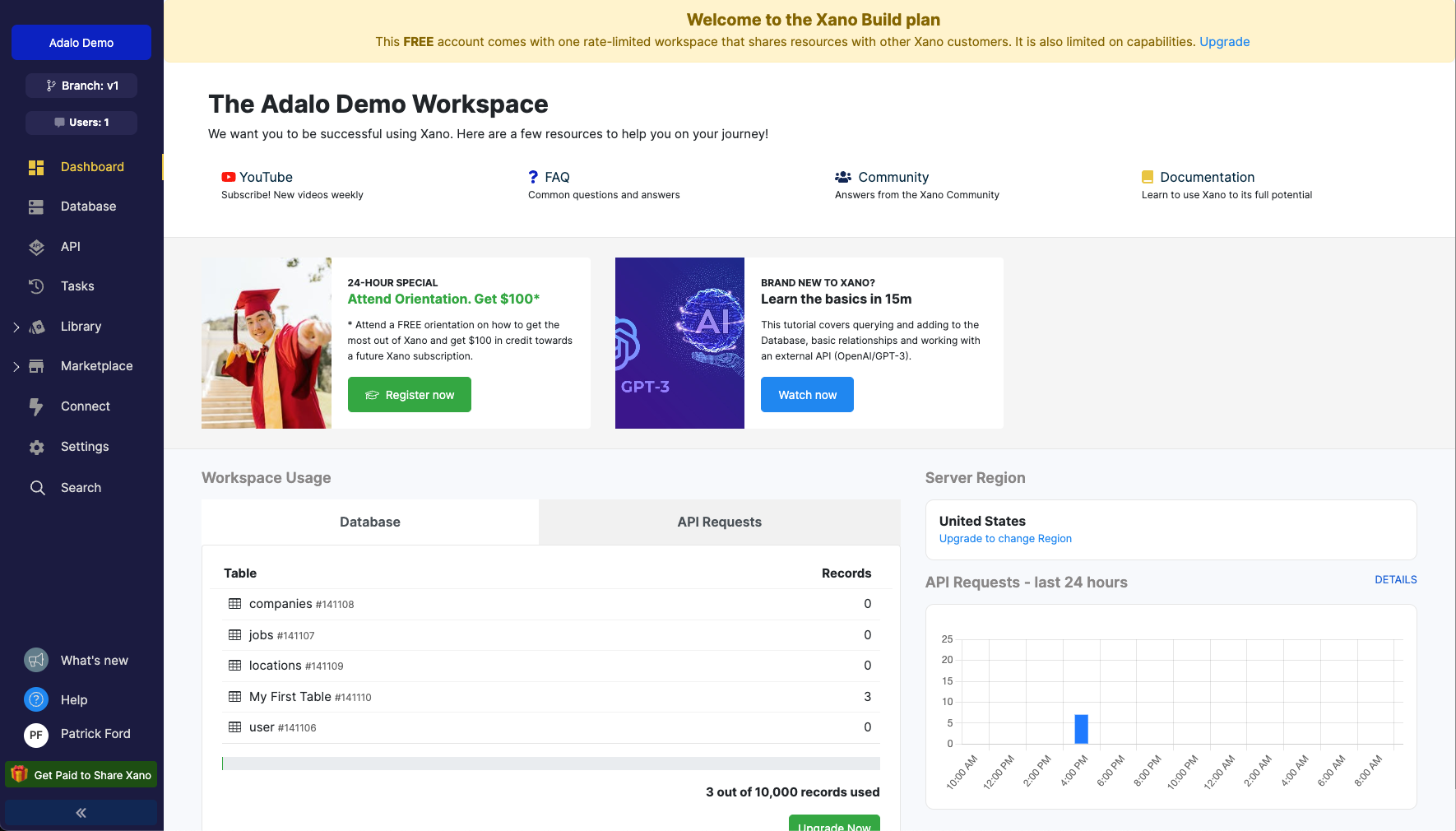 * Xanoはデフォルトで無料のBuildプランに設定されますが、いつでもアップグレードしてより多くのAPIリクエスト、スケーリングオプション、サーバーロケーション、レコード数、タスク作成などにアクセスできます。詳細は[Xanoの価格](https://www.xano.com/pricing/)ページをご覧ください。