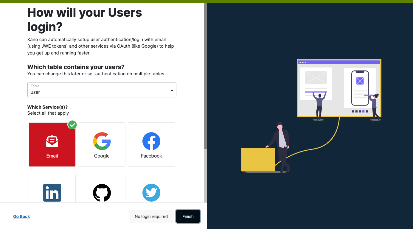 Xanoはこれらのサービスを使用できるようにするために必要なエンドポイントと機能を自動的に作成します。これにより、ゼロから設定する手間を省くことができます。これらはオプションであり、必要に応じて後でサービスを追加または削除することもできます。