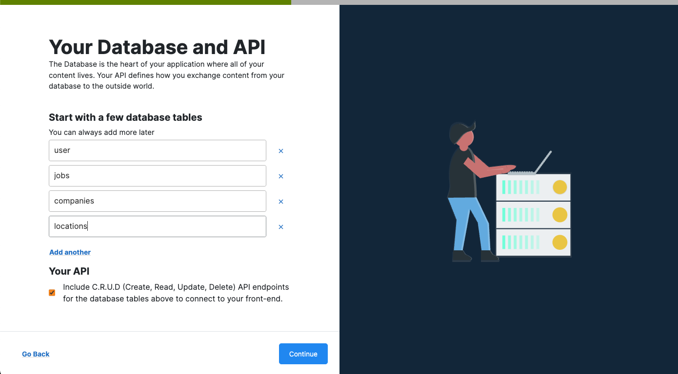 XanoのテーブルはAdaloのコレクションに相当します。必要に応じて後で追加、削除、または名前を変更できます！以下の例では、Jobs、Companies、Locationsのテーブルを作成しています。