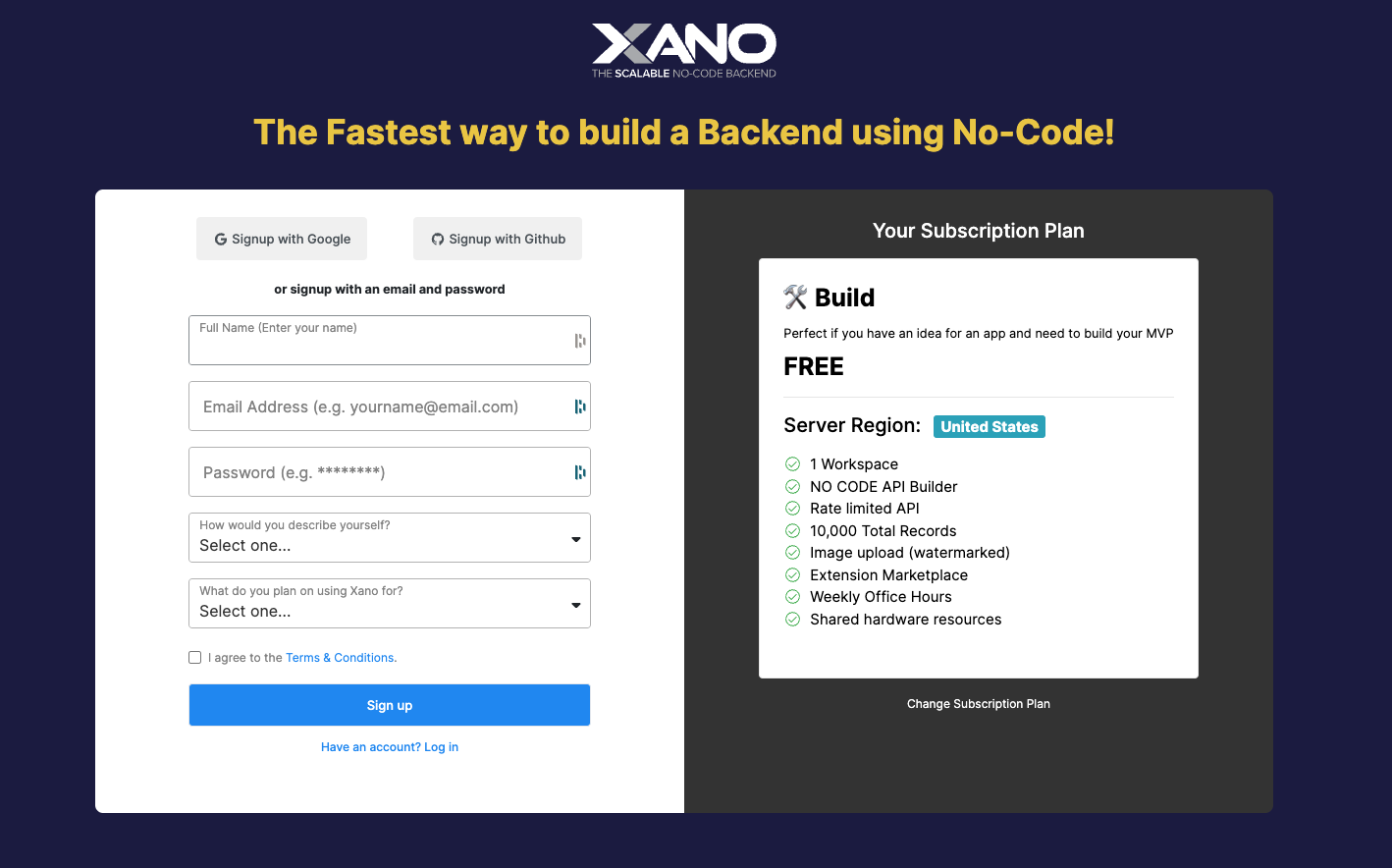 Xanoアカウントは[こちら](https://app.xano.com/admin/signup)から、メール、Google、またはGithubアカウントでサインアップできます。