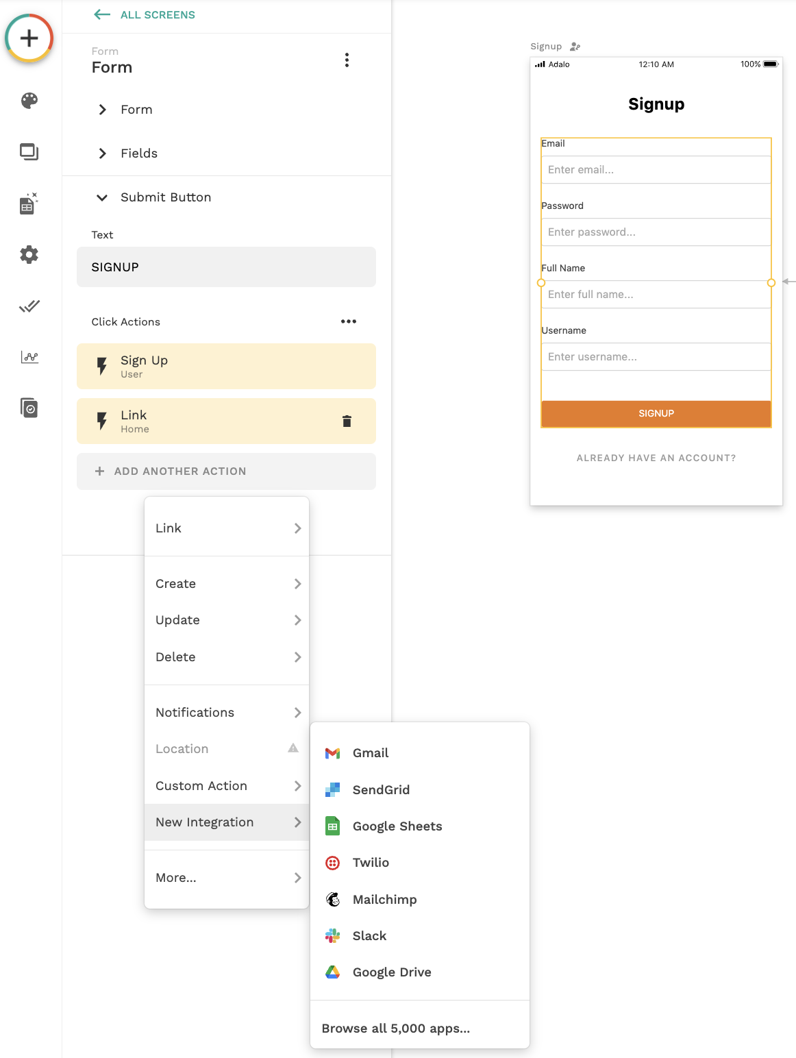 Adalo内から直接Zapierアカウントにアクセスするには、コンポーネントまたは画面アクションを使用していつでも新しい統合を追加できます：