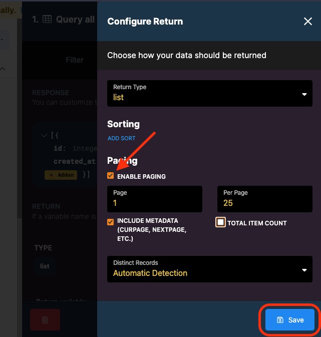 * You can change how many records are served to Adalo at a time by changing the Per Page number input seen in [Step 14](#14.-check-the-box-next-to-enable-paging-then-click-save.).