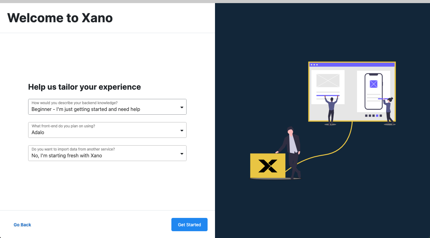 Make sure you choose "Adalo" as your front-end and "Starting fresh with Xano" as your data service.