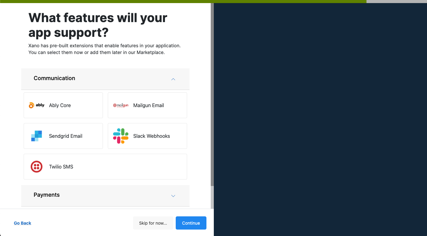 Xano will autocreate the necessary endpoints and functions to be able to use these services so that you can save valuable time in setting them up from scratch. These are optional and you can always add or remove services later if you want as well.