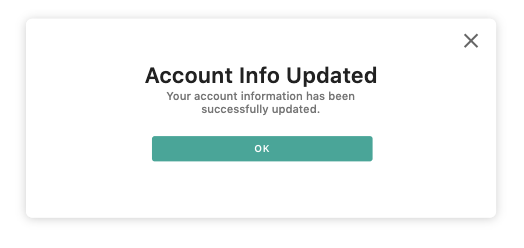 For the ‘Success Modal’ Screen — this screens acts as a confirmation that the user has updated their account info and provides a seamless transition to continue actions within the account.