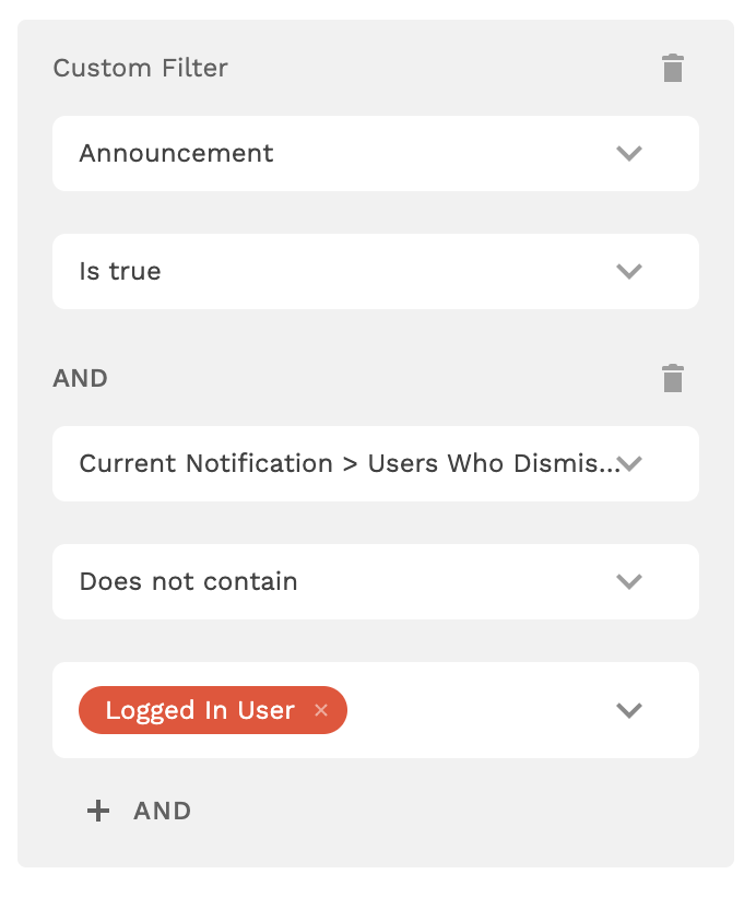 * The Users Who Dismissed the current notification does not contain the Logged In User. As in, the current logged in user has not dismissed the notification before.