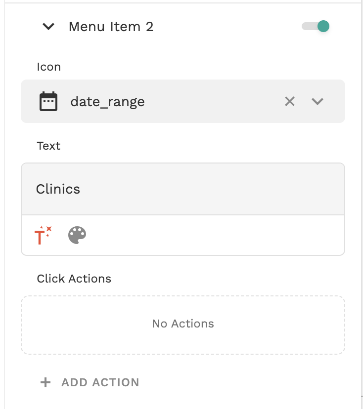 The Navigation is plan text that can be updated in the side panel within the Adalo Builder. In this case, the ‘Clinics’ Menu Item is Menu Item 2 and the settings look as follows:
