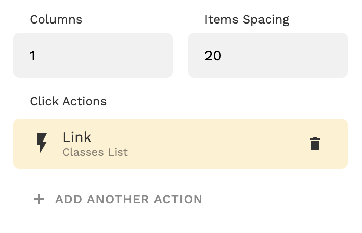 The list contains a Link Action to the ‘Classes List’ Screen.