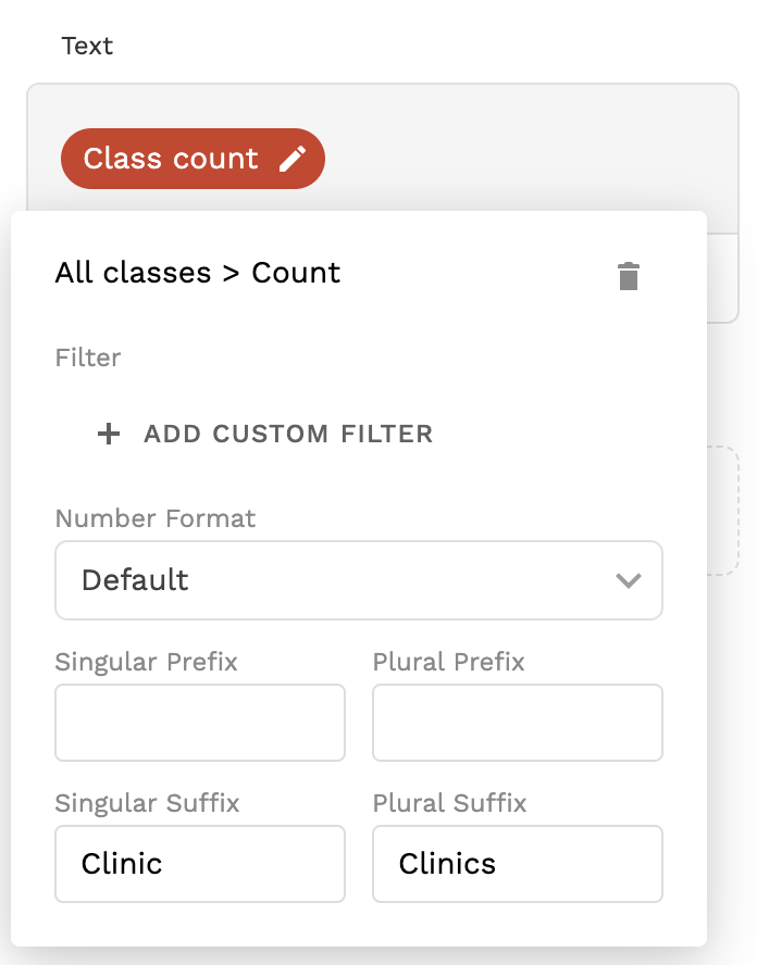 The text will portray the total number of classes that are available in the Classes Collection. Additionally, it will display the text “Clinic” or “Clinics” depending on the number shown.