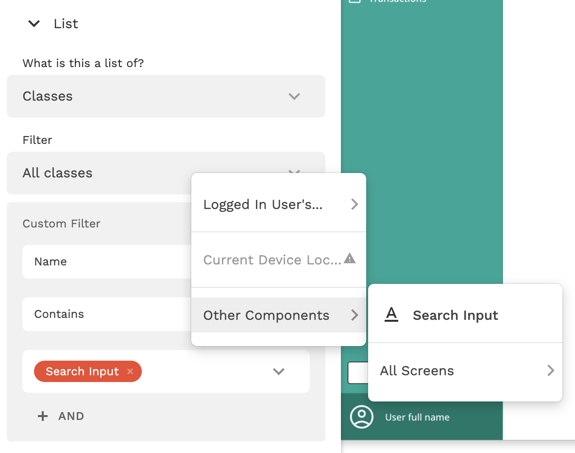 The value “Search Input” is available to filter by because it is another data-related component on the screen.