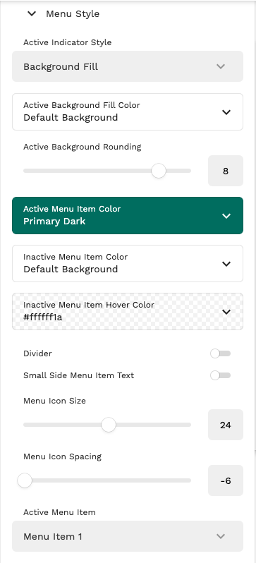 The ‘Active Indicator Style’ is set to reflect the screen that the Admin is currently viewing — on the ‘Admin Manage Clinics’ screen, that is “Manage Clinics.” To change these settings, find the Menu Style option in the lefthand panel: